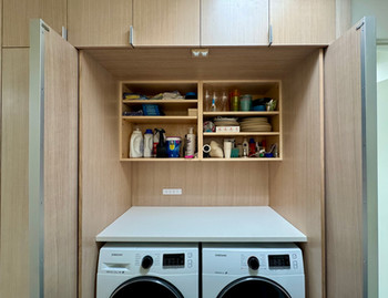 The result is simple, but it changes the whole feel of the house. The machines stop reading as exposed utility equipment. The hall feels calmer. The clutter has somewhere to go. And the whole thing looks like it belonged there all along.